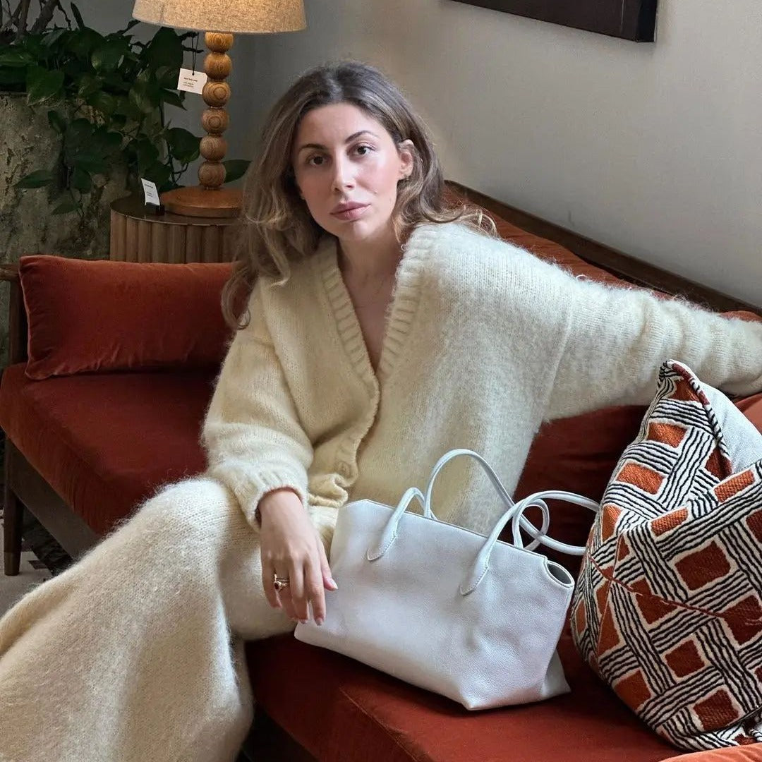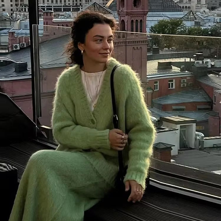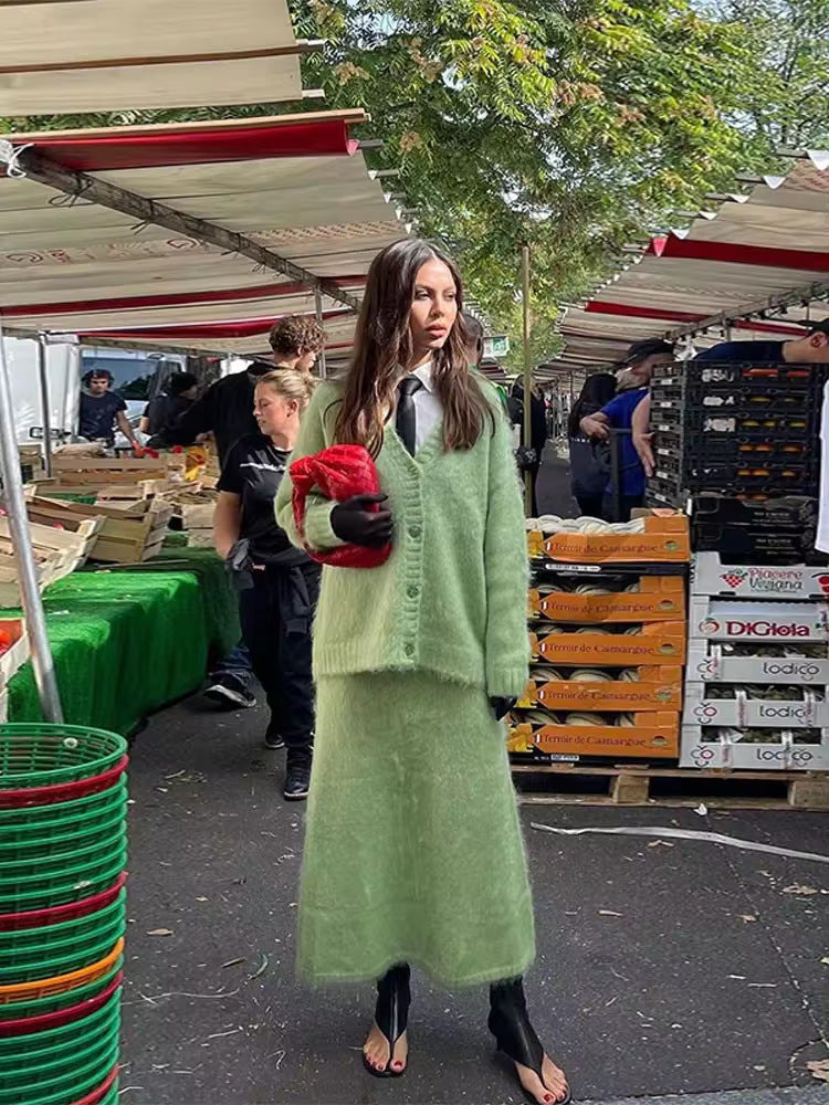 Composé d’un cardigan oversize et d’une jupe ajustée, cet ensemble met en valeur la silhouette tout en conservant une fluidité naturelle. Le cardigan, porté ouvert ou boutonné, apporte une touche décontractée, tandis que la jupe mi-longue offre une élégance intemporelle avec sa coupe légèrement asymétrique qui dynamise l’ensemble.