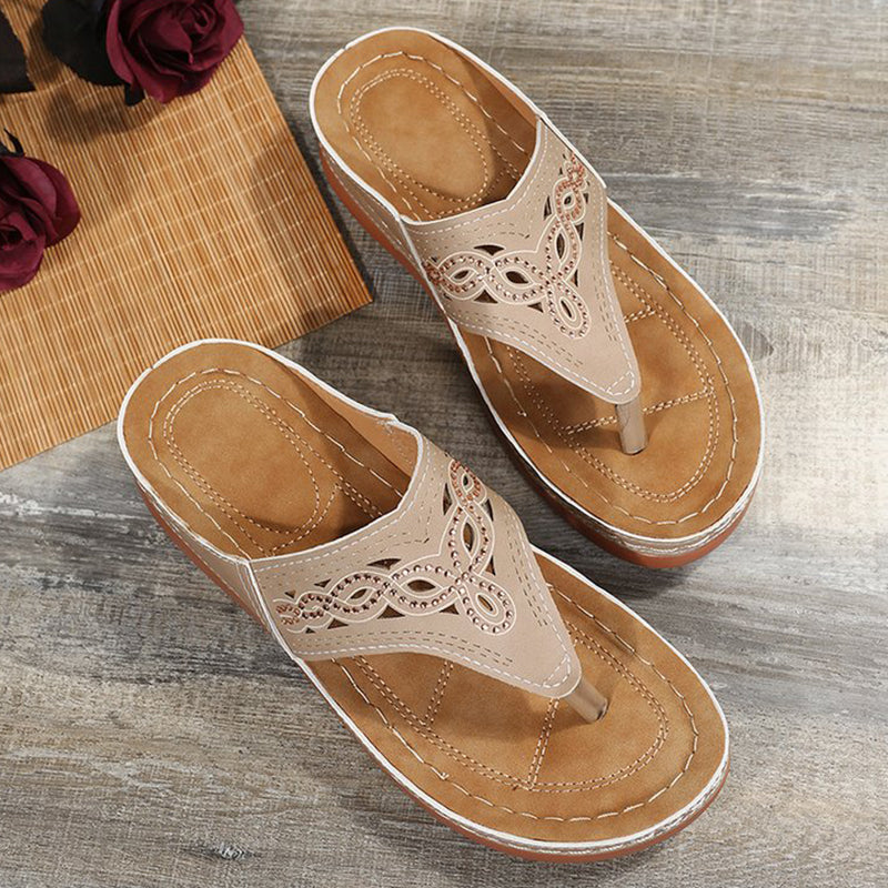 Le dessus de la sandale présente une découpe délicate accompagnée de petits ornements scintillants qui ajoutent une touche de féminité à l'ensemble. Les détails ajourés apportent non seulement du style, mais permettent également une bonne aération du pied, idéale pour les journées chaudes.