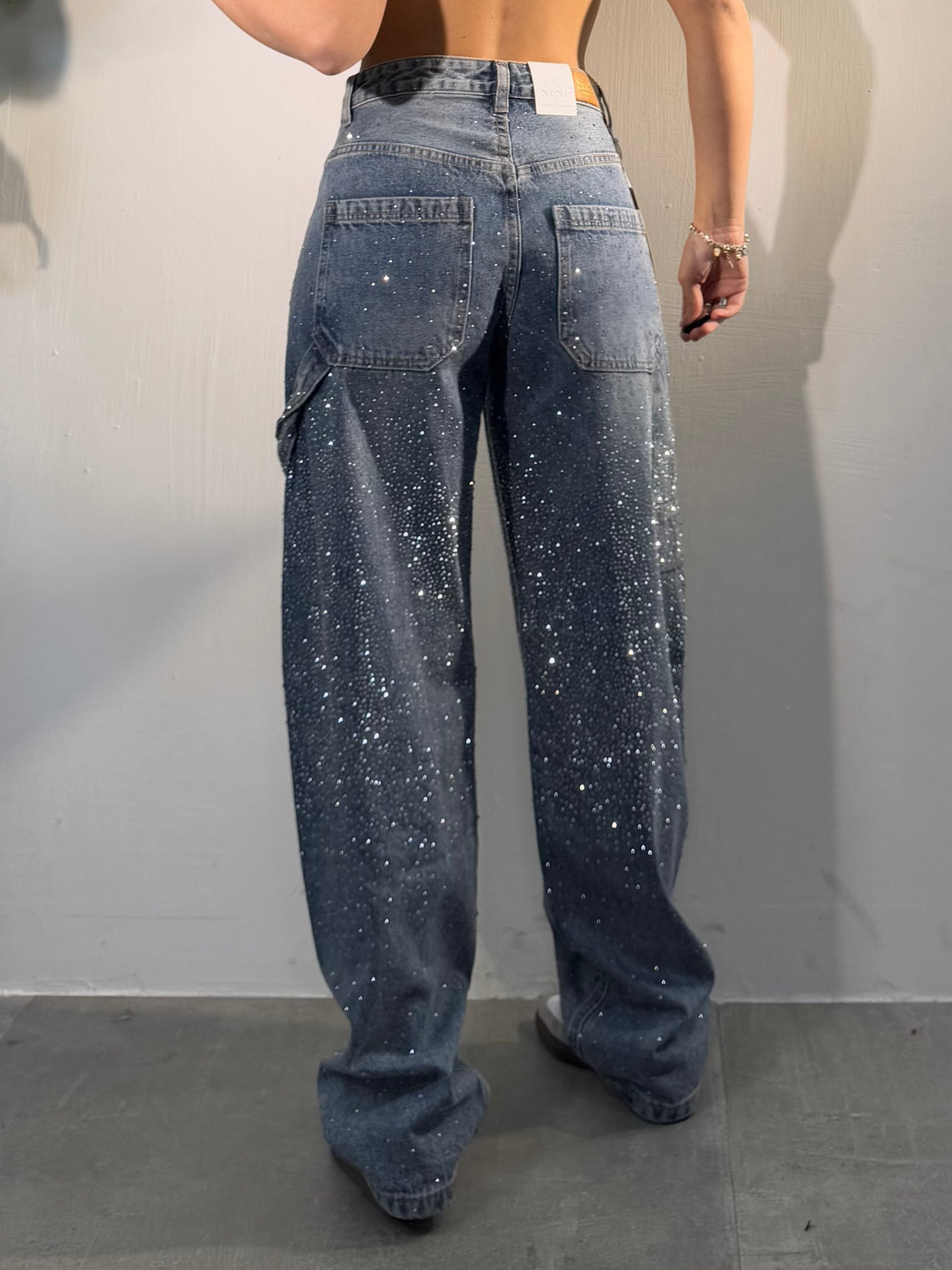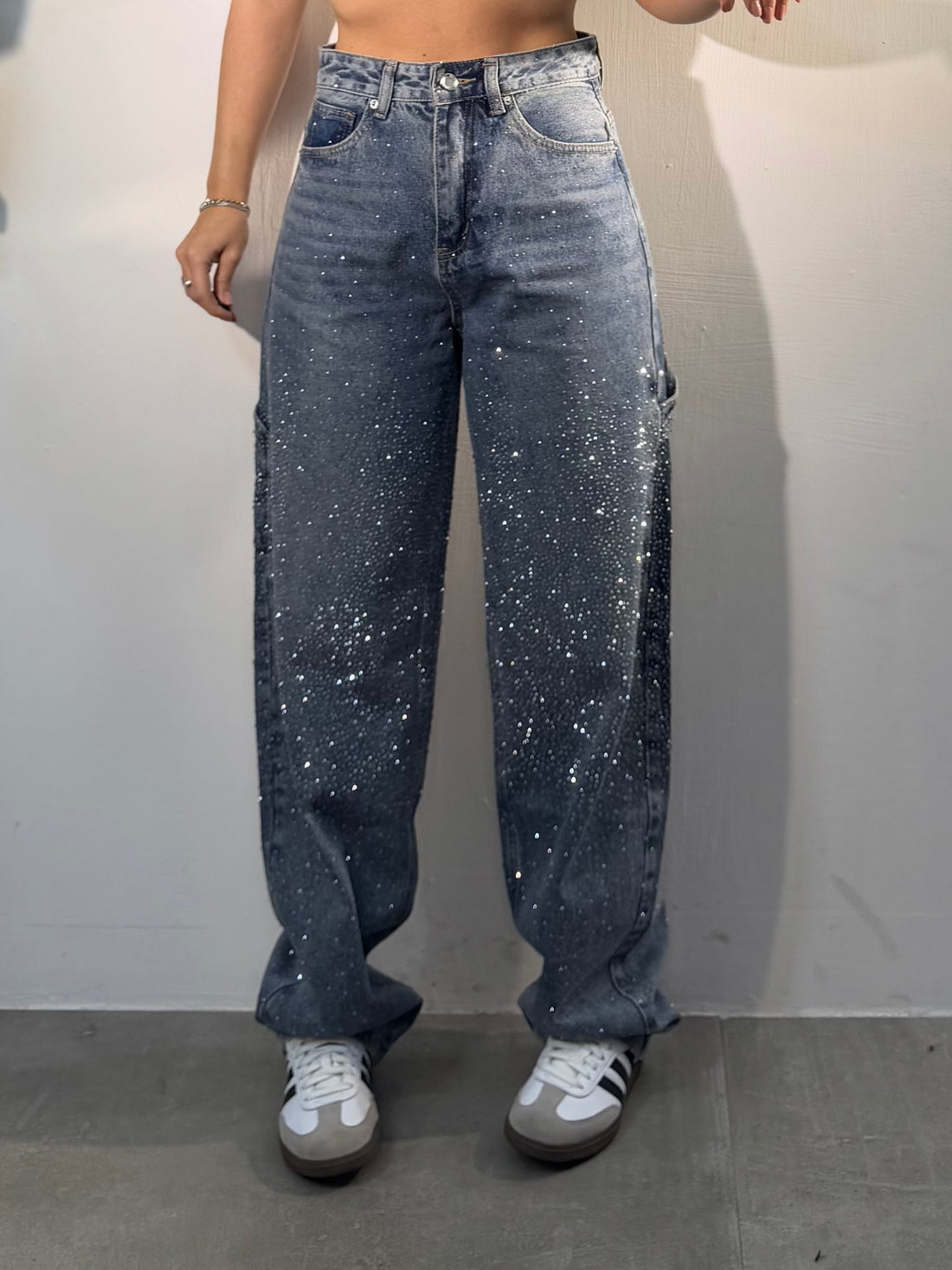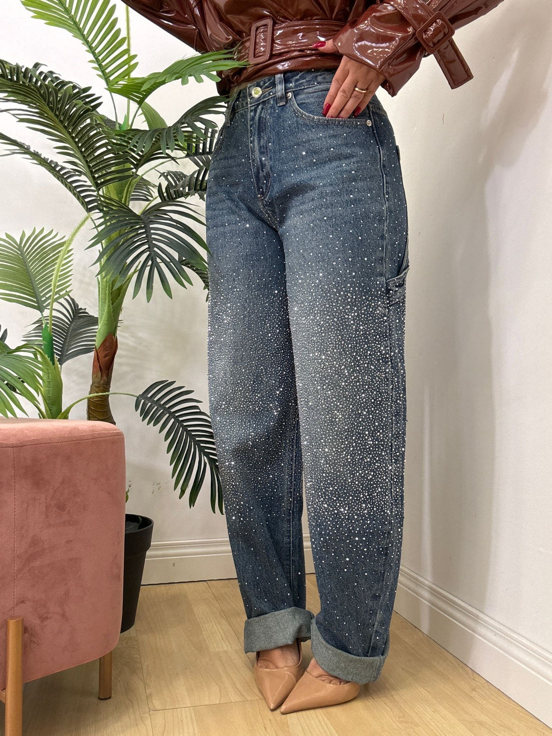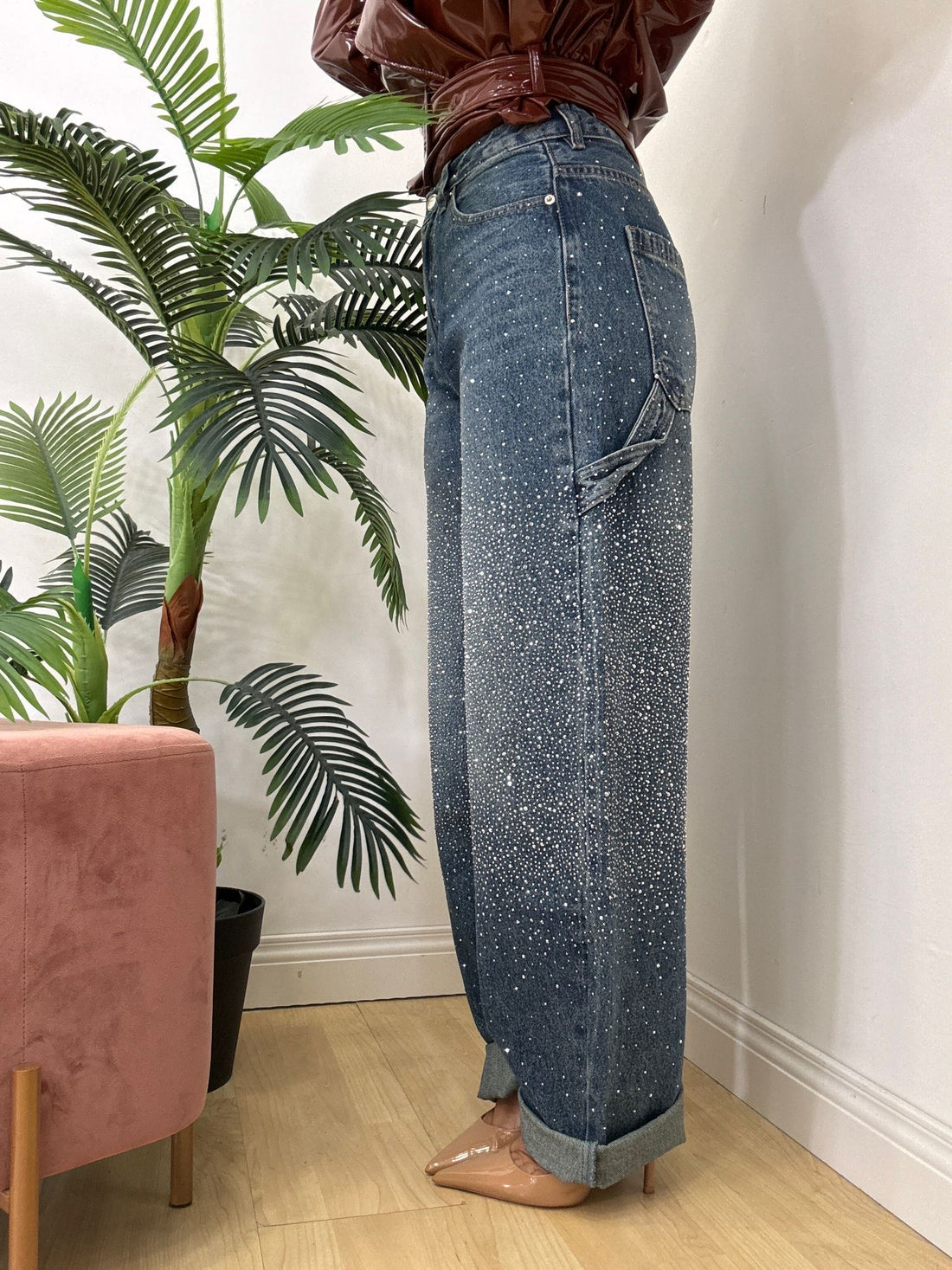Ce jean incarne une fusion parfaite entre le style décontracté et l'élégance moderne. Sa coupe large et droite offre une silhouette fluide et tendance, adaptée à un look urbain sophistiqué. Le denim bleu délavé apporte une touche vintage, tandis que les strass scintillants ajoutent une dimension glamour, captant la lumière à chaque mouvement Confort et Qualité