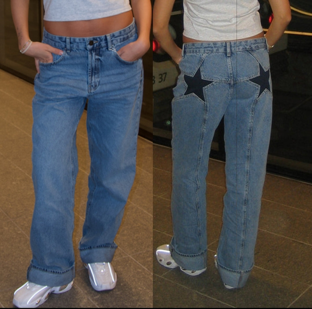 L’élément le plus marquant de ce jean réside à l’arrière, où deux grandes étoiles sont apposées sur les poches. Ce détail graphique ajoute une touche d’originalité et un contraste saisissant avec le denim. Cette conception donne un effet visuel fort, évoquant une esthétique inspirée des looks streetwear et des tendances vintage. La disposition des étoiles met en valeur la silhouette et confère au pantalon un aspect unique et reconnaissable.
