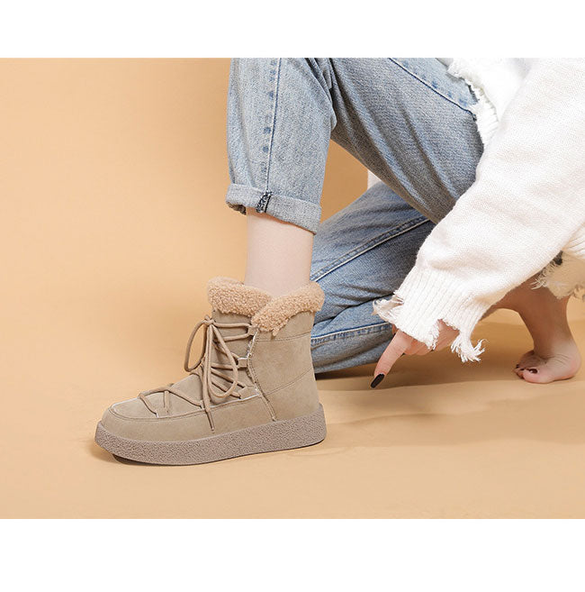 Ces bottes affichent une silhouette contemporaine à la fois douce et affirmée. Leur teinte marron clair et leur semelle épaisse ajoutent une touche sportive et moderne à votre look hivernal. Le laçage frontal donne une allure dynamique tout en garantissant un ajustement parfait, tandis que la bordure en fausse fourrure apporte une note cosy irrésistible.