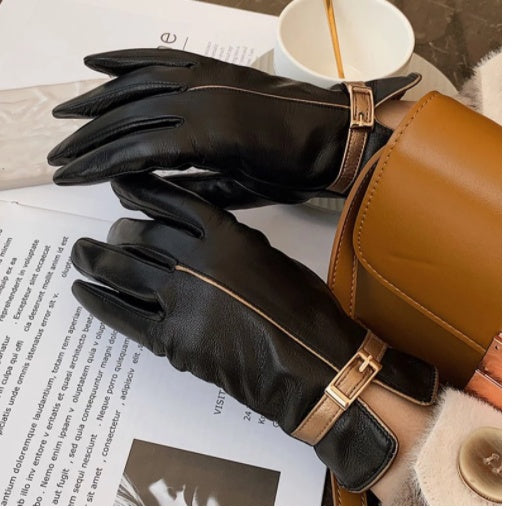 Un des éléments distinctifs de ces gants est la fine bande marron qui traverse le poignet, ajoutant une touche de contraste subtil. Cette bande est agrémentée d’une boucle métallique dorée, un détail chic qui évoque les accessoires de luxe. Une couture fine et précise longe les doigts et le dos de la main, accentuant leur design soigné et structuré.